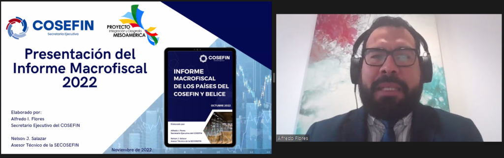 Durante el encuentro virtual, el Mtro. Alfredo Flores Sarria, Secretario Ejecutivo de COSEFIN, presentó el análisis del impacto de la COVID-19 en la política fiscal de los países miembros del COSEFIN: Costa Rica, El Salvador, Guatemala, Honduras, Nicaragua, Panamá y República Dominicana, así como de Belize. Además, la Lic. Alexya Pérez, Project Officer del Ministry of Foreign Affairs, Foreign Trade and Immigration de Belize, abordó la política fiscal de su país en el marco de la pandemia, la reactivación económica y la recuperación nacional.