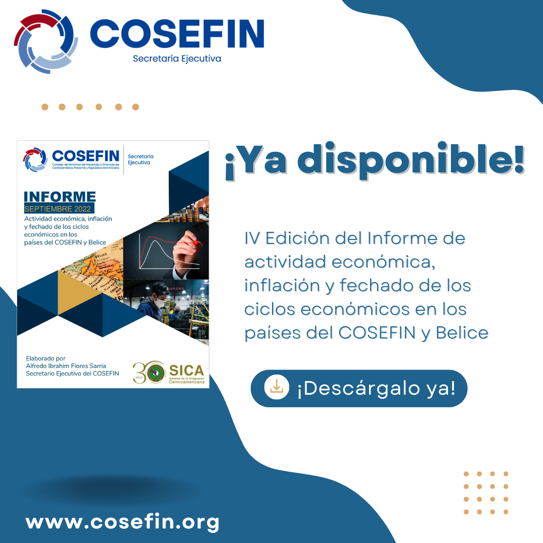 Nuestro Secretario Ejecutivo pone a disposición la IV edición del Informe de actividad económica, inflación y fechado de los ciclos económicos en los países del COSEFIN y Belice, el cual tiene como objetivo describir la evolución reciente de la actividad económica, de la inflación y la postura del ciclo económico para los países miembros del Consejo de Ministros de Hacienda o Finanzas de Centroamérica, Panamá y República Dominicana (COSEFIN) y para Belice.